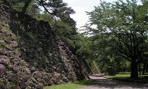 石垣を背に馬場を見る。桜の見ごろは4月下旬。