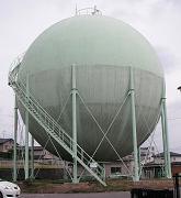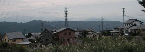 坂の上から小諸市街・北アルプスを望む。ガスタンクと送電鉄塔(#42,ぶるう#54)が見える。